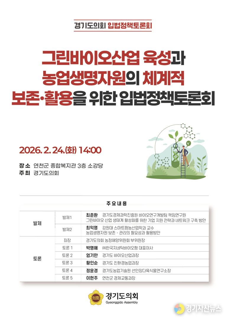 경기도의회는 오는 24일 오후 2시 연천군 종합복지관 3층 소강당에서 ‘그린바이오산업 육성과 농업생명자원의 체계적 보존·활용을 위한 입법정책토론회’를 개최한다.