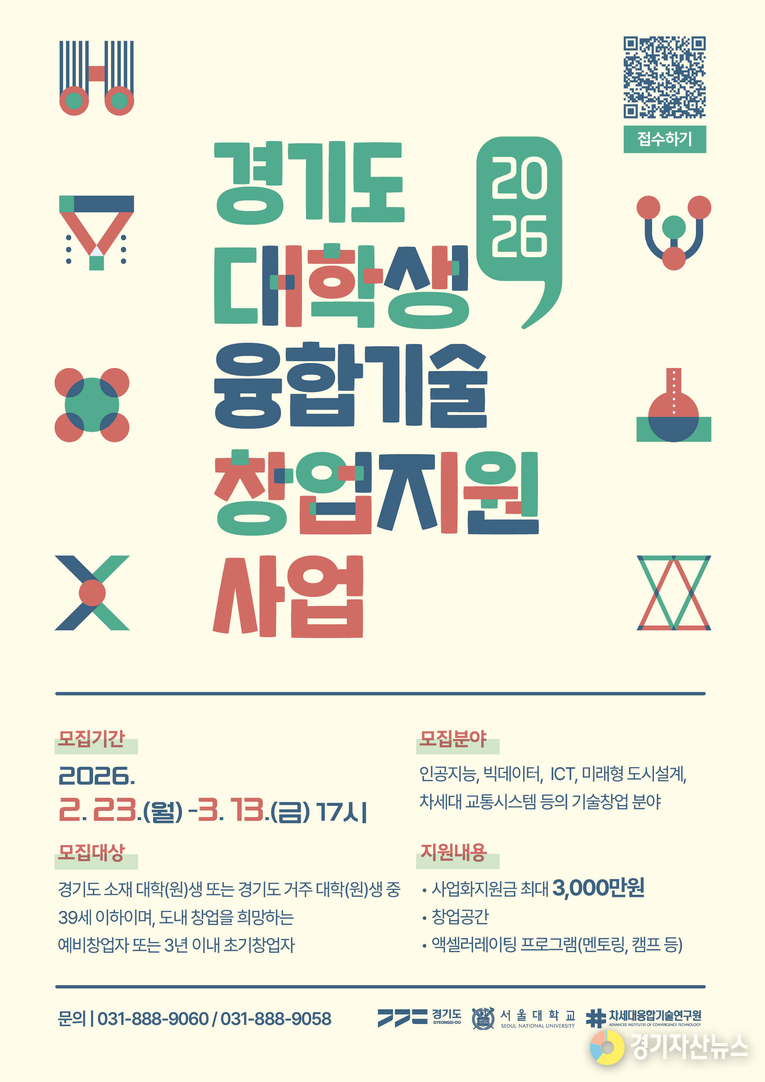 경기도와 차세대융합기술연구원(이하 융기원)은 ‘2026년 경기도 대학(원)생 융합기술 창업지원’ 사업 참가자를 다음 달 13일까지 모집한다.