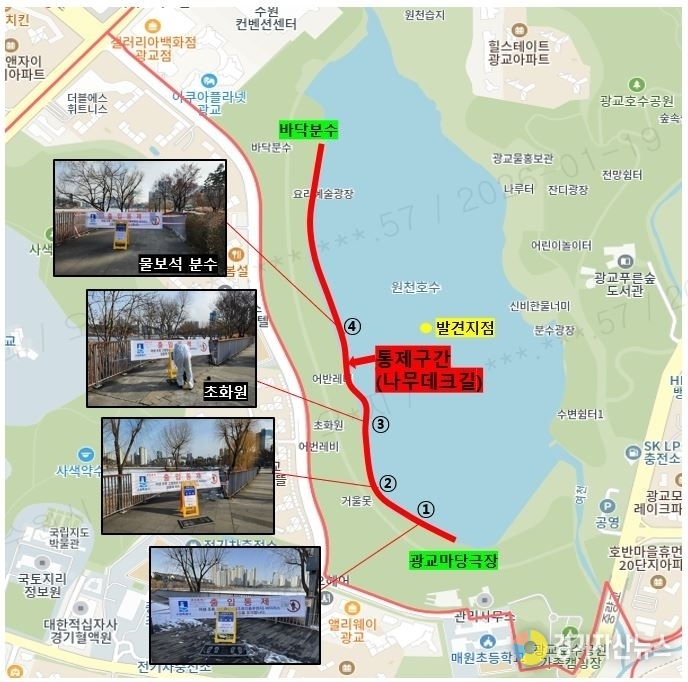 시는 원천호수 산책로 하부 구간(나무데크길)을 2월 3일까지 시민들의 출입을 통제한다는 방침이다.