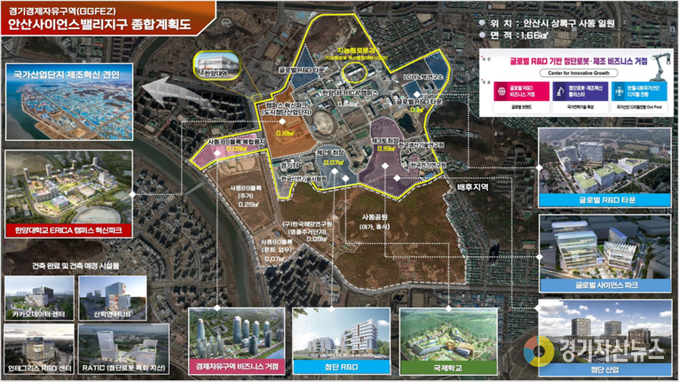 안산사이언스밸리(ASV)는 안산시 사동 일원 1.66㎢(약 50만 평) 규모 부지에 조성되며, 2025년부터 2032년까지 4,105억 원이 투입된다.