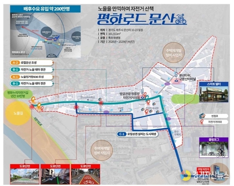 파주시 문산읍은 문산역과 노을길, 평화누리길로 이어지는 자전거 네트워크를 활용해 자전거 특화 지역특화재생사업을 추진한다. 문산천의 노을 경관과 자전거, 쉼터를 결합한 복합문화공간을 조성하고 자전거 이용자 중심의 도로환경 개선을 통해 지역 활력 제고를 도모할 예정이다.