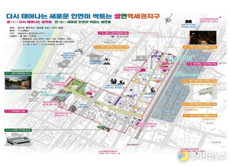 사업 내용을 살펴보면 동두천시 생연동은 성매매 집결지 철거 후 공원과 주차장 등 생활 사회간접자본(SOC)을 조성한다. 맹지 해소 도로개설사업 등 환경개선사업과 이와 연계한 노후주택 리모델링 등 노후주거지정비 지원사업으로 저층 주거지의 정비를 유도할 계획이다.