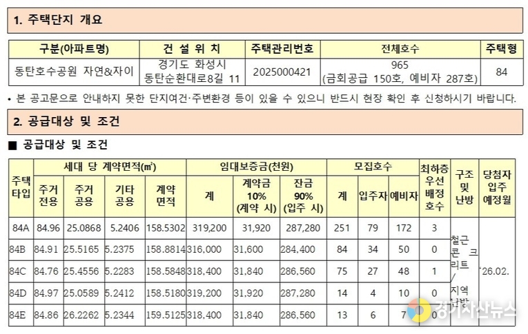 동탄호수공원 자연&자이 장기전세주택은 전용 84㎡ 5개 타입, 총 965세대로 구성됐으며 지하 2층, 지상 28층 규모의 8개 동으로 조성됐다.
