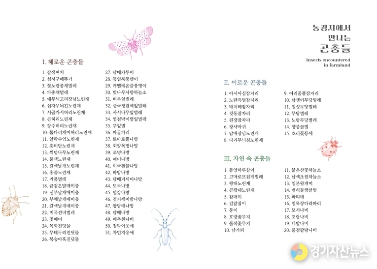 도감에는 경기 지역 밭에서 확인된 곤충 86종이 수록됐다. 도농기원은 농가가 해충방제와 천적 보호 시점을 스스로 판단할 수 있도록 돕기 위해 밭에서 실제로 관찰되는 곤충 정보가 담긴 도감을 제작했다고 설명했다.